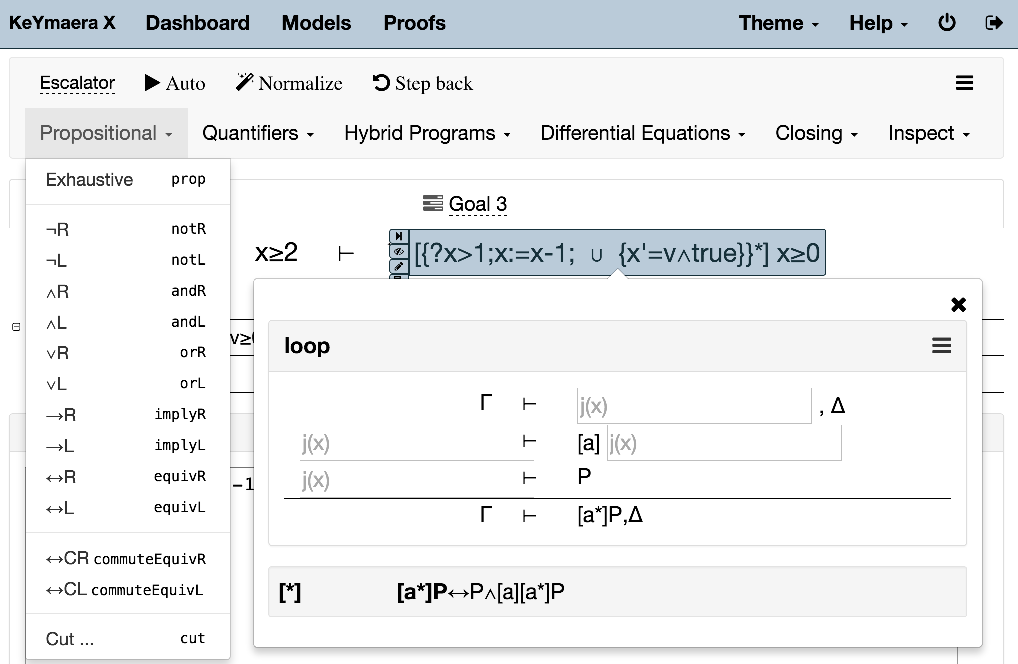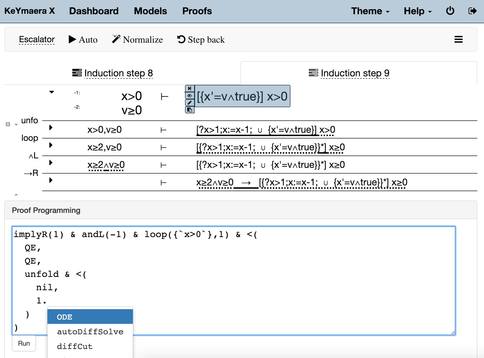 Watch KeYmaera X script your interactive proofs while you are clicking on how you want to decompose your system. Write your own proof scripts and experience how they interact with the graphical sequent proof view.